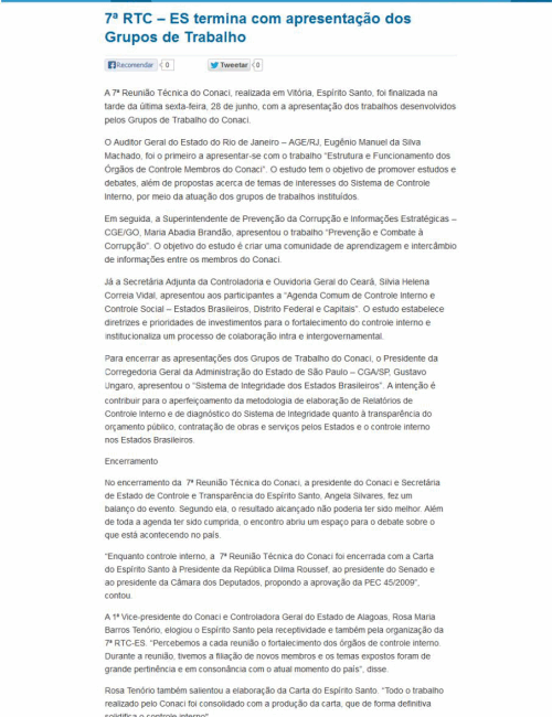 “Enquanto controle interno, a 7ª Reunião Técnica do Conaci foi encerrada com a Carta do Espírito Santo à Presidente da República Dilma Roussef, ao presidente do Senado e ao presidente da Câmara dos Deputados, propondo a aprovação da PEC 45/2009”, contou.