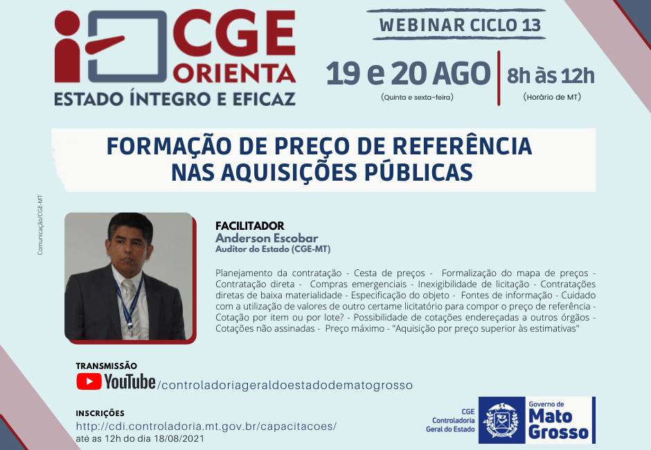 Como parte da perspectiva de atuação preventiva, a Controladoria Geral do Estado de Mato Grosso (CGE-MT) abriu as inscrições para o 13º ciclo online do Programa CGE ORIENTA – Estado Íntegro e Eficaz, cujo tema será “Formação de Preço de Referência nas Aquisições Públicas”. A próxima etapa está marcada para ser realizada nos dias 19 e 20 de agosto (quinta e sexta-feira), das 8h às 12h, com transmissão ao vivo pelo canal de YouTube da CGE.
