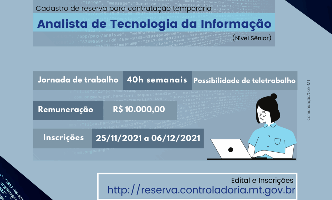 A Controladoria Geral do Estado (CGE-MT) iniciou, na última quinta-feira (25/11), o período de inscrições para o seletivo simplificado destinado à formação de cadastro de reserva para contratação de analista de tecnologia da informação (nível sênior), na carreira dos profissionais de Desenvolvimento Econômico Social.