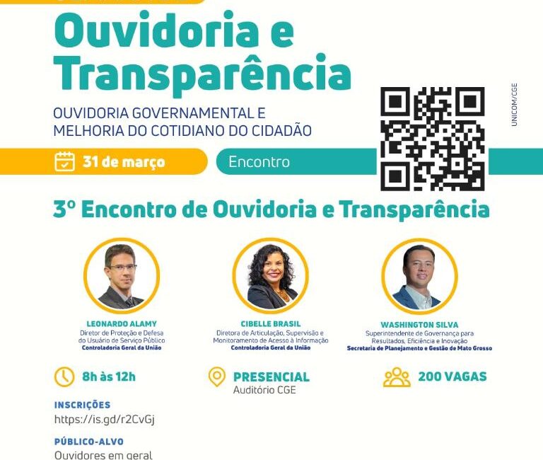Com o tema central “Ouvidoria Governamental e Melhoria no Cotidiano do Cidadão”, a Controladoria-Geral do Estado de Mato Grosso (CGE-MT) promove a Semana de Ouvidoria e Transparência nos dias 30 e 31 de março e 1º de abril. O evento reunirá ouvidores, equipes técnicas e profissionais da área para fortalecer práticas de escuta ativa, transparência pública e inovação no serviço público.