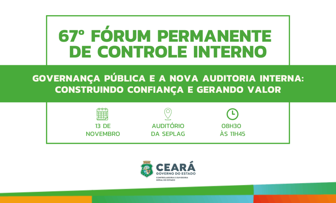 Estão abertas as inscrições para o 67º Fórum Permanente de Controle Interno, que tem a temática “Governança Pública e a Nova Auditoria Interna: Construindo Confiança e Gerando Valor”. O evento será realizado no dia 13 de novembro de 2025, no Auditório da Secretaria do Planejamento e Gestão (Seplag), das 8h às 12h.