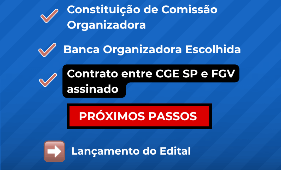 O contrato, com prazo de vigência de 12 meses, tem como objeto de contratação o recrutamento e seleção de pessoal para o concurso público e prevê a inscrição de pelo menos 20 mil candidatos para o preenchimento dos 200 cargos de Auditor Estadual de Controle autorizados pelo Governador Tarcísio de Freitas, em maio deste ano. O próximo passo é a divulgação do edital que terá o detalhamento de inscrições, data da prova e matérias avaliadas.