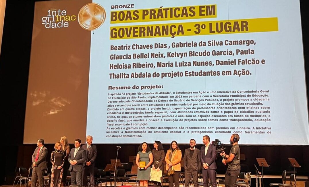 O projeto Estudantes em Ação, desenvolvido pela Controladoria Geral do Município de São Paulo (CGM-SP) em parceria com a Secretaria Municipal de Educação (SME), foi reconhecido com o 3º lugar (bronze) na categoria Boas Práticas em Governança do Prêmio INAC de Integridade, promovido pelo Instituto Não Aceito Corrupção (INAC).