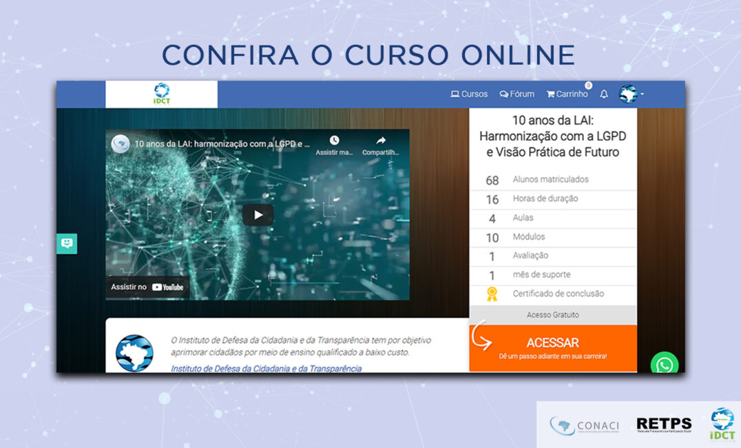 O Conselho Nacional de Controle Interno (Conaci), em conjunto com o Instituto de Defesa da Cidadania e da Transparência (IDCT) e a Rede pela Transparência e Participação Social (Retps), lançou hoje, 14, o curso EAD “10 anos da LAI: Harmonização com a LGPD e Visão Prática de Futuro”. Esta capacitação é complementar ao webinar que aconteceu no último dia 24 e tem o objetivo de capacitar gratuitamente as pessoas interessadas no tema.