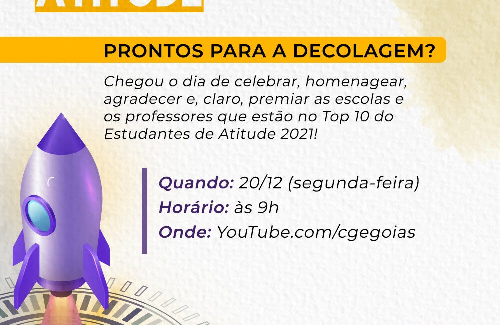 O Governo de Goiás, por meio da Controladoria-Geral do Estado (CGE) e da Secretaria da Educação (Seduc), realiza a premiação das escolas campeãs do projeto Estudantes de Atitude na segunda-feira (20/12), a partir das 9 horas. O evento será realizado no Goiânia Arena, com a presença de cerca de 5 mil alunos de escolas da rede estadual de ensino e contará com as presenças do governador Ronaldo Caiado; do controlador-geral do Estado, Henrique Ziller e da secretária de Educação, Fátima Gavioli. O evento será transmitido ao vivo pelo canal da CGE no YouTube (www.youtube.com/cgegoias) e pelas redes do governo de Goiás.