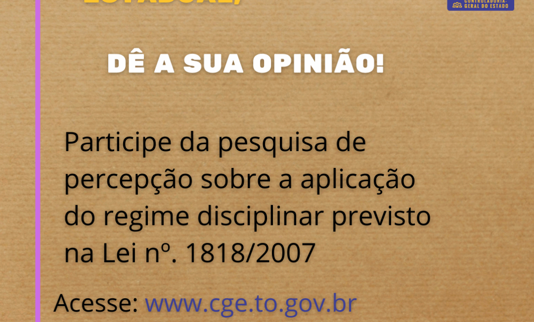 Dentre as ações lançadas durante a live comemorativa pelo Dia do Servidor Público, na tarde desta quinta-feira, 28, pelo Governo do Tocantins, está a pesquisa de percepção sobre a aplicação do regime disciplinar previsto no Estatuto dos Servidores Públicos Civis do Estado do Tocantins (Lei nº 1.818/2007). O questionário está disponível por meio do link https://forms.gle/37b6XvVTLc5paBK27 e pode ser respondido pelos servidores e as servidoras do Poder Executivo Estadual até o dia 27 de novembro deste ano.