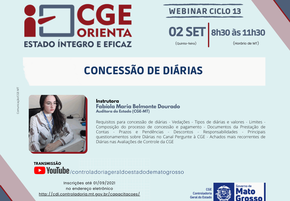 A Controladoria Geral do Estado de Mato Grosso (CGE-MT) abriu as inscrições para o 13º ciclo online do “Programa CGE ORIENTA – Estado Íntegro e Eficaz”, cujo tema será “Concessão de Diárias”. A palestra virtual está marcada para a próxima quinta-feira (02.09), das 8h30 às 11h30, com transmissão ao vivo pelo canal de Youtube da CGE.