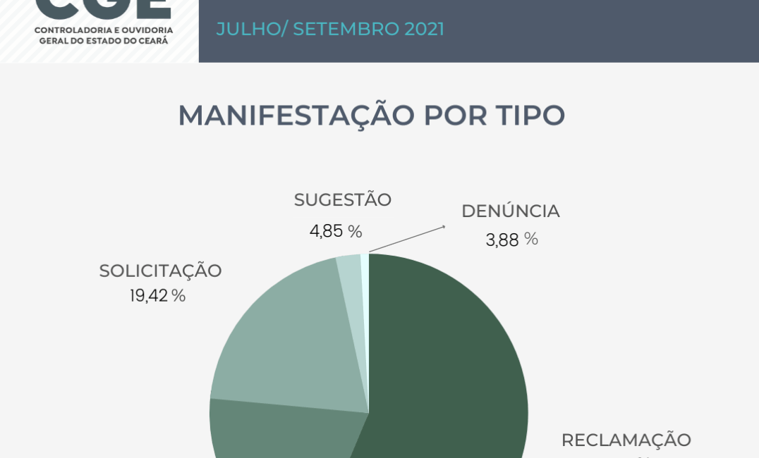 A Ouvidoria Setorial da Controladoria e Ouvidoria Geral do Estado (CGE) divulgou, nesta quinta-feira (28), o boletim trimestral do serviço no órgão. Ao todo, a setorial registrou 103 manifestações registradas pelos cidadãos, sendo 53 reclamações, 21 elogios, 20 solicitações, 5 sugestões e 4 denúncias. Os dados divulgados foram contabilizados de julho a setembro deste ano.