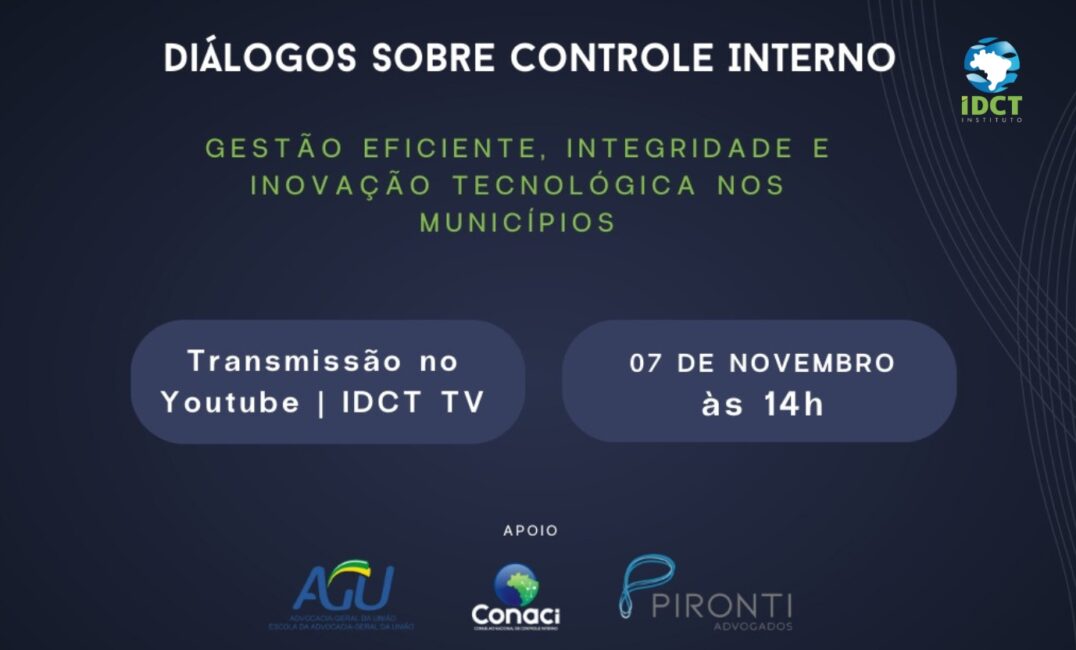 O Conselho Nacional de Controle Interno (Conaci) apoia a última edição do “Diálogos Sobre Controle Interno”, promovida pelo Instituto de Defesa da Cidadania e da Transparência (IDCT). O evento vai acontecer no dia 07 de novembro, às 14h. O último Diálogos promete abordar temas essenciais para a gestão pública nos municípios, trazendo à temática “Gestão eficiente, Integridade e Inovação Tecnológica”. O apoio da Escola da Advocacia-Geral da União em Minas Gerais, AGU/MG, e do Pironti Advogados fazem parte da edição de fechamento que é 100% online e 100% gratuito.