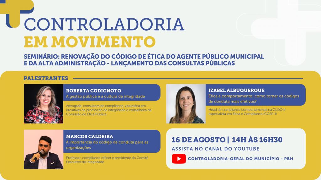A Prefeitura de Belo Horizonte, por meio da Controladoria-Geral do Município, realizará, na próxima terça-feira, dia 16 de agosto, o Seminário “Renovação do Código de Ética do Agente Público e da Alta Administração”. O objetivo do evento é lançar as consultas públicas para os agentes públicos municipais e para a sociedade contribuírem com a renovação do Código, além de fortalecer a cultura de integridade e de valores éticos.