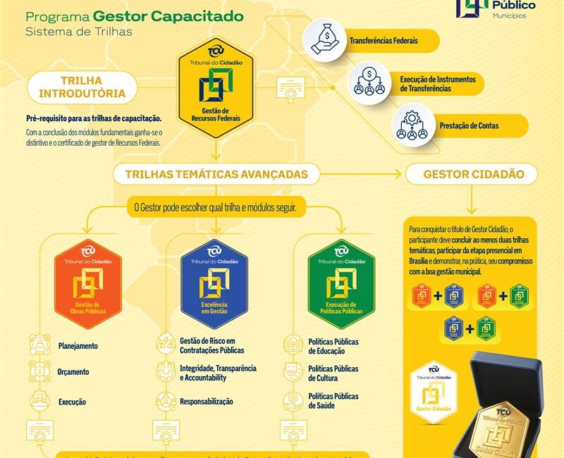 O Tribunal de Contas da União (TCU) lança o Programa Gestor Capacitado, iniciativa integrada ao programa Diálogo Público – Municípios e voltada a prefeitos, gestores públicos e equipes técnicas dos municípios brasileiros. O objetivo é apoiar a administração regional na aplicação correta dos recursos federais, por meio de capacitação gratuita e on-line, com módulos técnicos aplicados à realidade local.