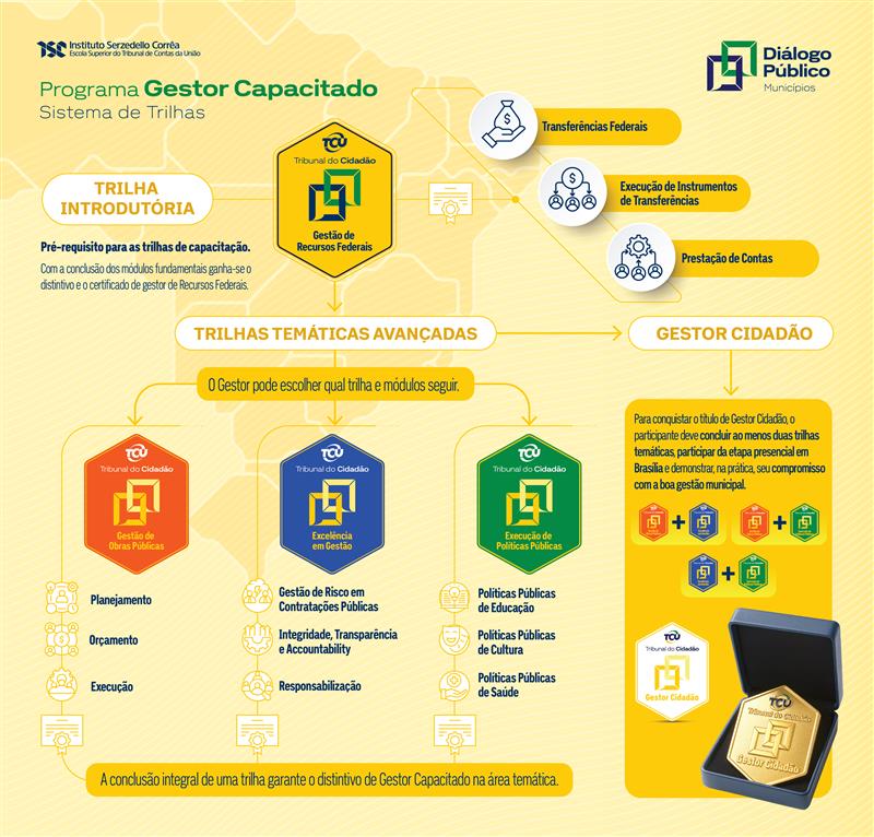 O Tribunal de Contas da União (TCU) lança o Programa Gestor Capacitado, iniciativa integrada ao programa Diálogo Público – Municípios e voltada a prefeitos, gestores públicos e equipes técnicas dos municípios brasileiros. O objetivo é apoiar a administração regional na aplicação correta dos recursos federais, por meio de capacitação gratuita e on-line, com módulos técnicos aplicados à realidade local.