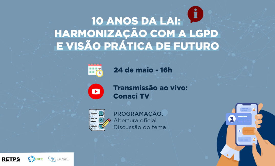 O Conselho Nacional de Controle Interno (Conaci), em conjunto com a Rede pela Transparência e Participação Social (RETPS) e o Instituto de Defesa da Cidadania e Transparência (IDCT), promovem na próxima terça-feira (24) o webinar “10 anos da LAI: Harmonização com a LGPD e Visão Prática de Futuro”. O evento será gratuito, com transmissão pelo Conaci TV, no YouTube, a partir das 16h.